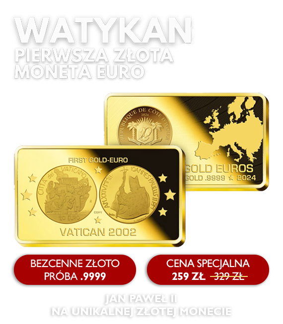 Oferta specjalna na złotą monetę kolekcjonerską z Janem Pawłem II Najnowsza, niepowtarzalna emisja kolekcjonerska 2024 – upamiętniająca Jana Pawła II oraz pierwszą złotą monetę Euro wyemitowaną przez Watykan w roku 2002 – dostępna jest teraz w specjalnej, promocyjnej cenie 259 zł. Ze względu na nieustannie rosnące ceny złota, AZ Aurum zastrzega sobie możliwość zmiany cen kolejnych monet w kolekcji.