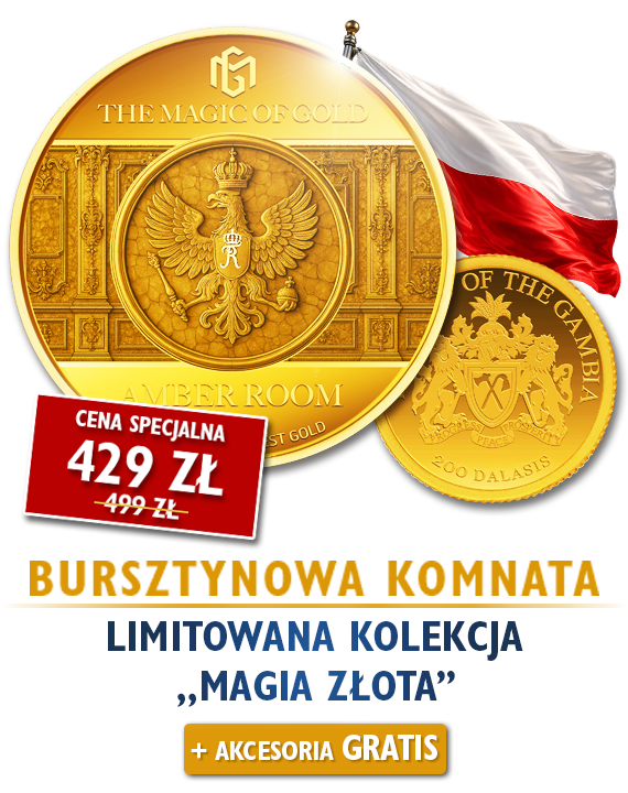 Oficjalna złota moneta kolekcjonerska „Bursztynowa Komnata” – będąca częścią limitowanej kolekcji numizmatycznej „Magia Złota” – upamiętnia na swym rewersie „ósmy cud świata”, jedno z najbardziej niezwykłych dzieł sztuki w historii Europy. To hołd dla historii ziemi polskiej!