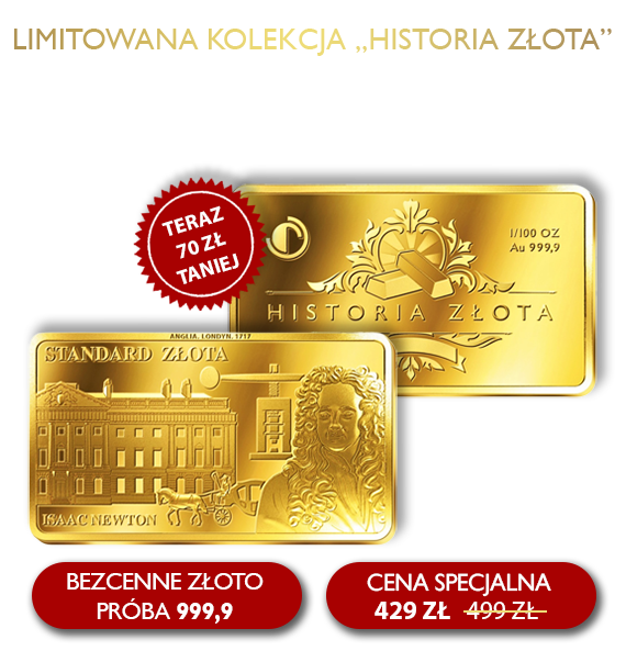 Ważna Informacja! Dokonując zakupu złotej sztabki „Standard Złota” w cenie specjalnej 429 zł jednocześnie rozpoczynam kolekcjonowanie sztabek z limitowanej kolekcji „Historia Złota”. Kolejne 13 sztabek otrzymam w miesięcznych odstępach, każdą w cenie 499 zł. Koszt pakowania i wysyłki 14,99 zł. Płatność za kolejne sztabki na podstawie faktury dołączonej do przesyłki.